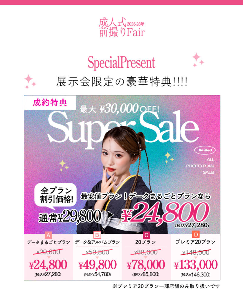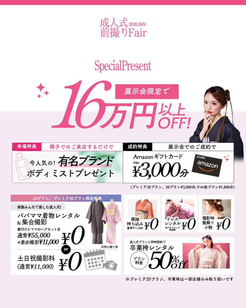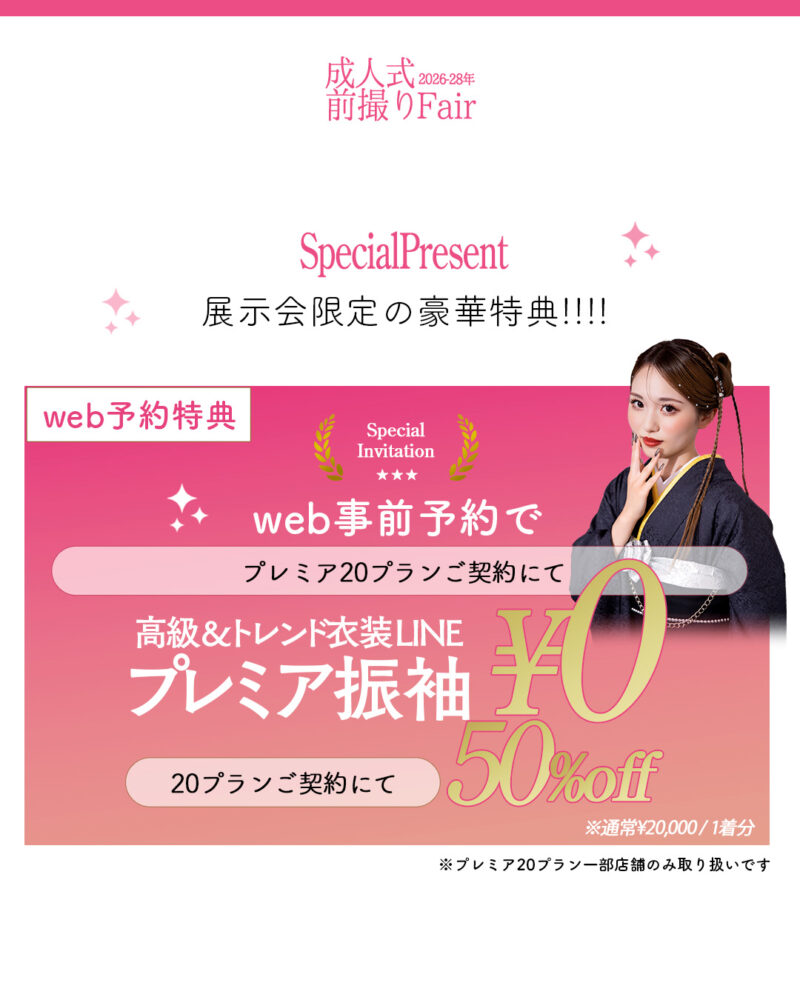 当店1番人気の成人式当日レンタル・お支度・前撮り付き”コミコミ20プラン”をご契約の方に最大12万円相当分をプレゼント!