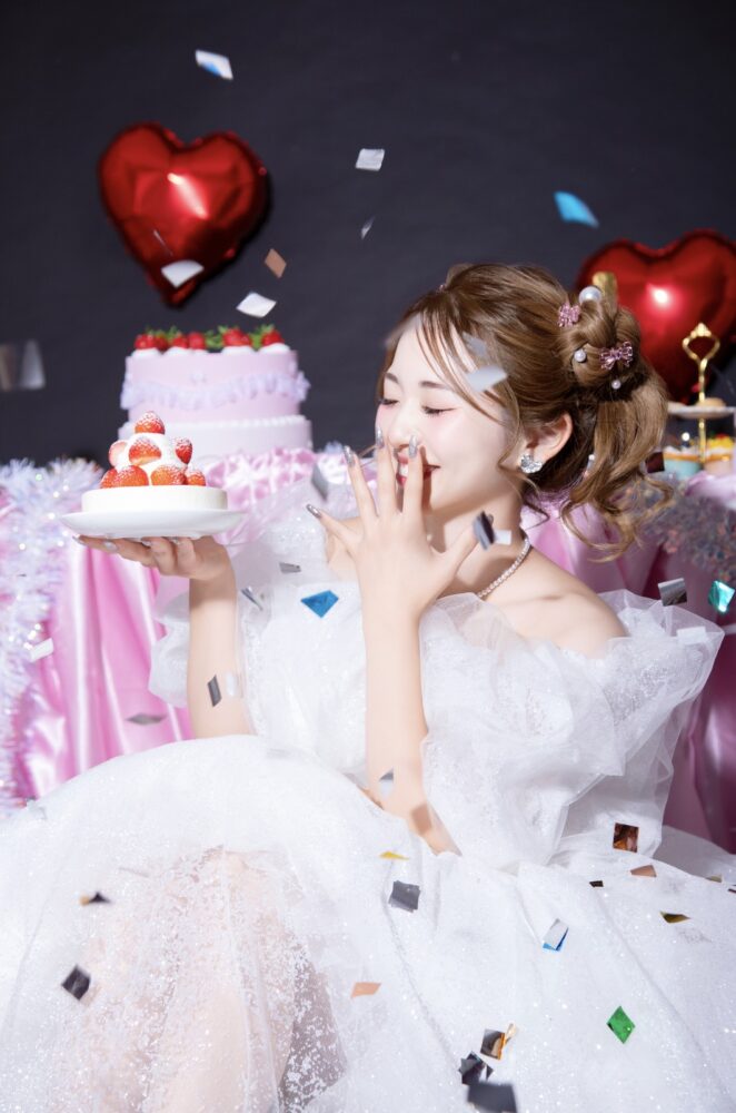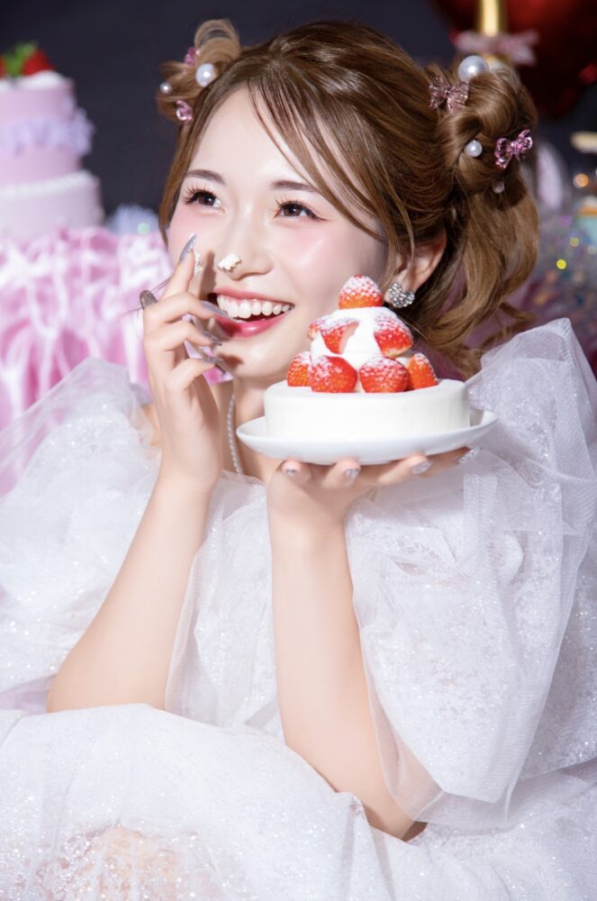 おすすめのポーズは背景に合わせケーキを持って撮影するポーズ🧁