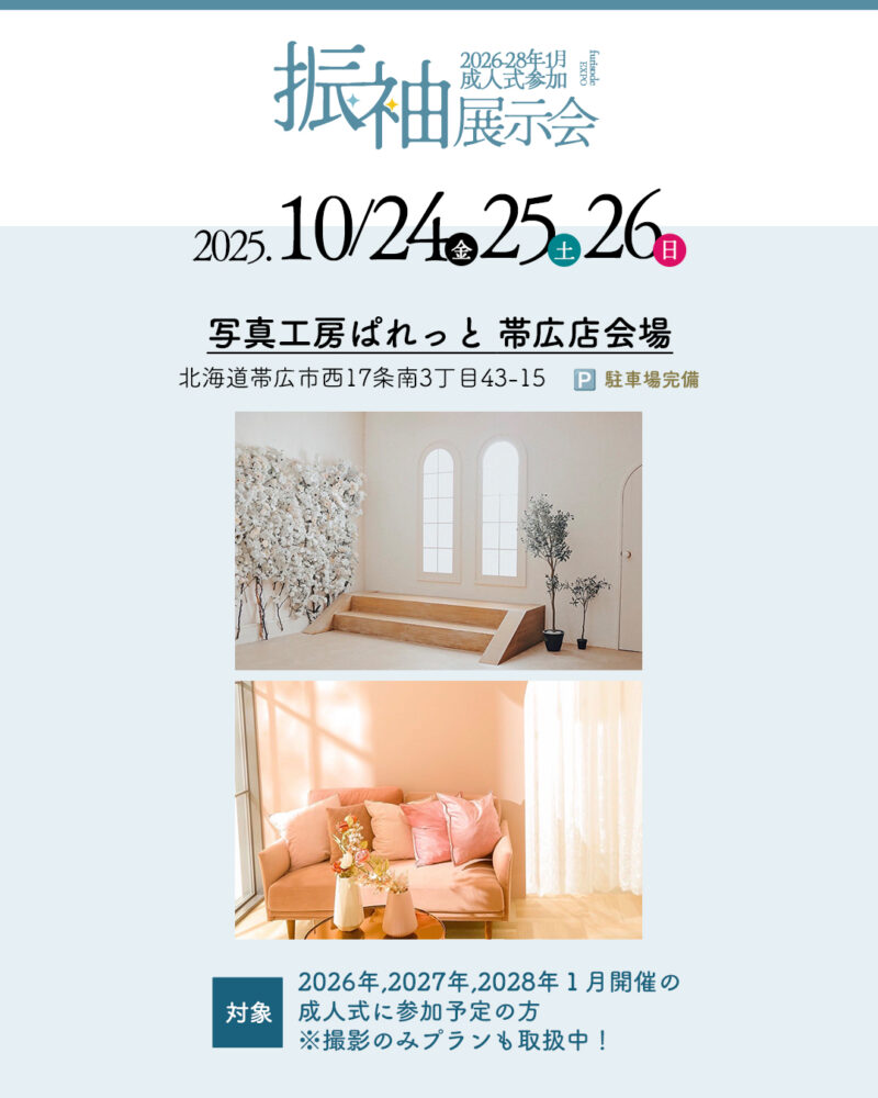こんにちは! 北海道札幌市にある写真工房ぱれっと帯広店です! 10月限定『振袖展示会』ご予約受付開始いたしました!! カウンセリングは全て無料✨さらにカウンセリング当日にご試着可能です! カウンセラーがお客様に合ったプランやお衣装をご提案させていただきますので、ぜひお気軽にご来店ください♪