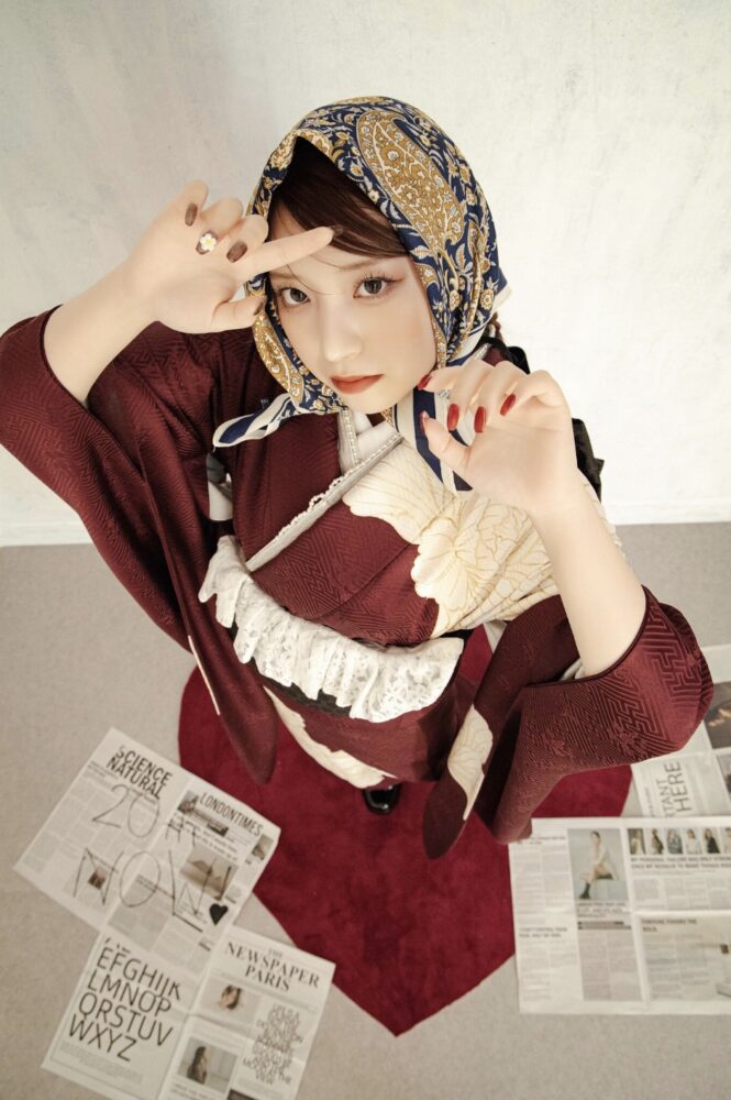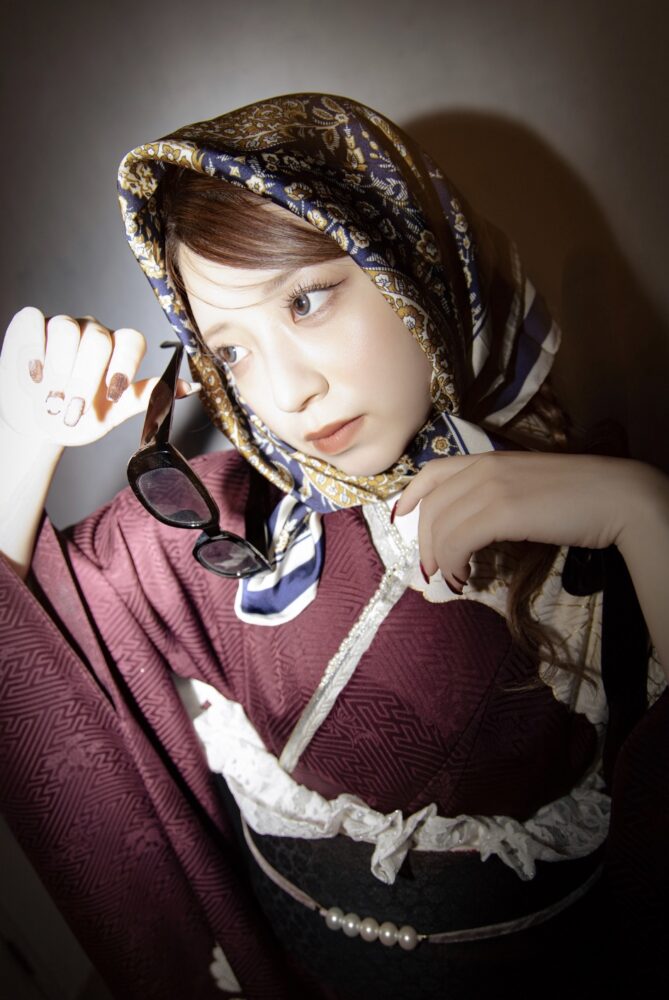 ボルドー振袖とバンダナ➕サングラスで、レディ・シックな個性を解放する。