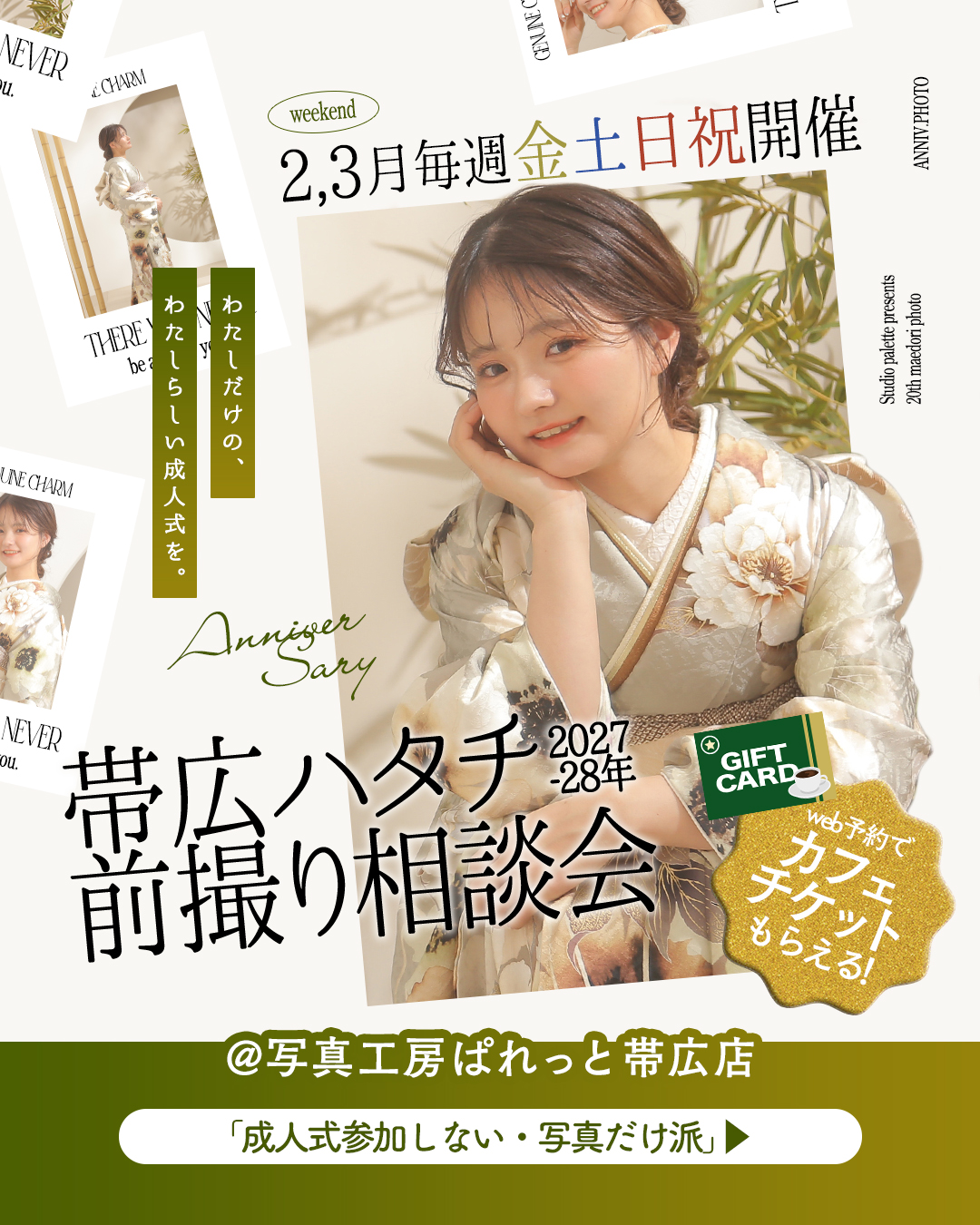 こんにちは! 北海道帯広市にある写真工房ぱれっと帯広店です! 『帯広ハタチ 前撮り相談会』ご予約受付開始いたしました!! カウンセリングは全て無料さらにカウンセリング当日にご試着可能です! カウンセラーがお客様に合ったプランやお衣装をご提案させていただきますので、ぜひお気軽にご来店ください♪