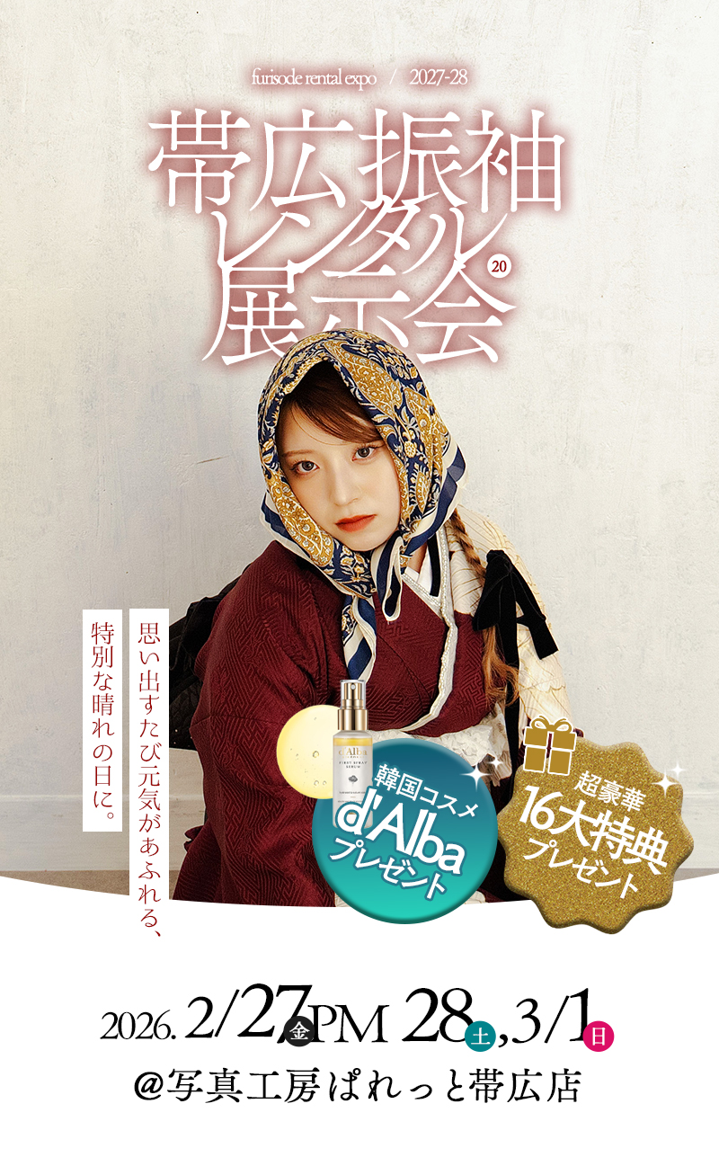 こんにちは! 北海道帯広市にある写真工房ぱれっと帯広店です! 2026年2月27,28,3月1日限定『振袖展示会』ご予約受付開始いたしました!! 2027年成人式をお控えのお嬢様必見!!振袖は一点もの!!”好み”の振袖を早めに決めて一生に一度の記念日に備えましょう♪ カウンセリングは全て無料さらにカウンセリング当日にご試着可能です! カウンセラーがお客様に合ったプランやお衣装をご提案させていただきますので、ぜひお気軽にご来店ください♪