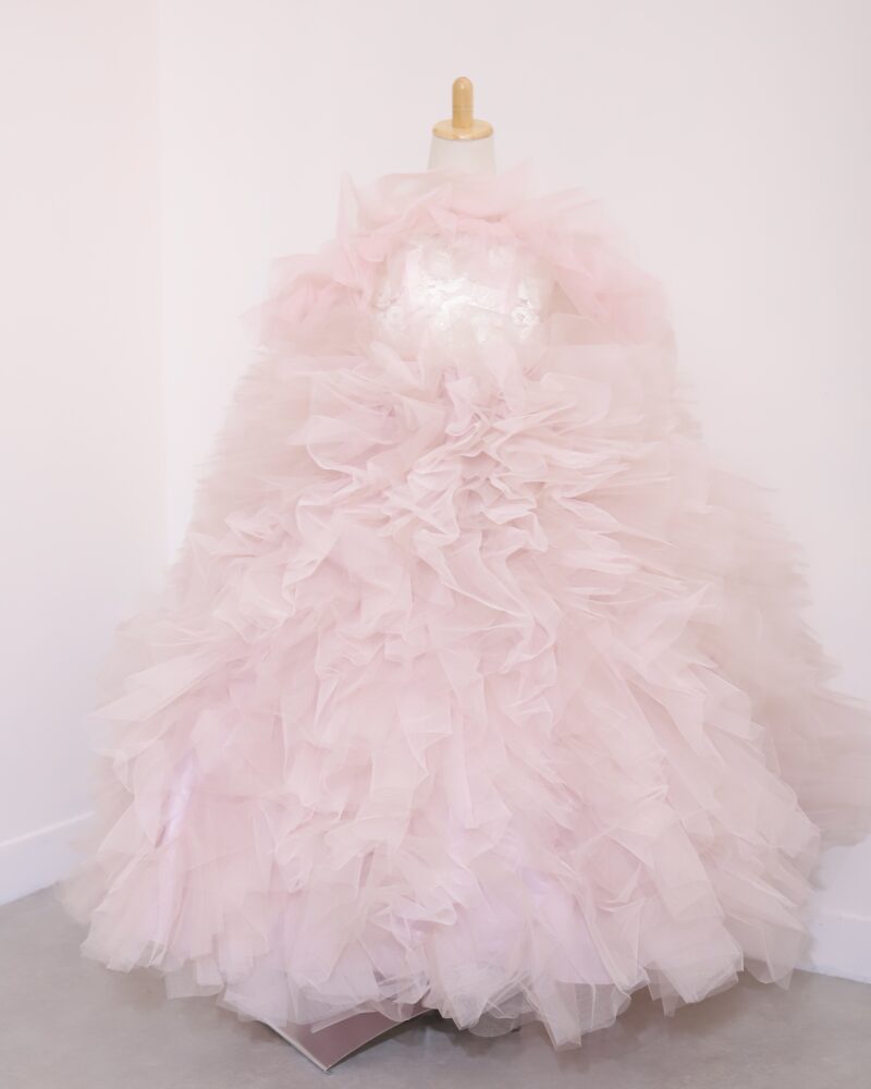 非常に軽やかで、全体的にふわふわとした質感のチュールが大量に使用されている優しい色合いのドレス✨