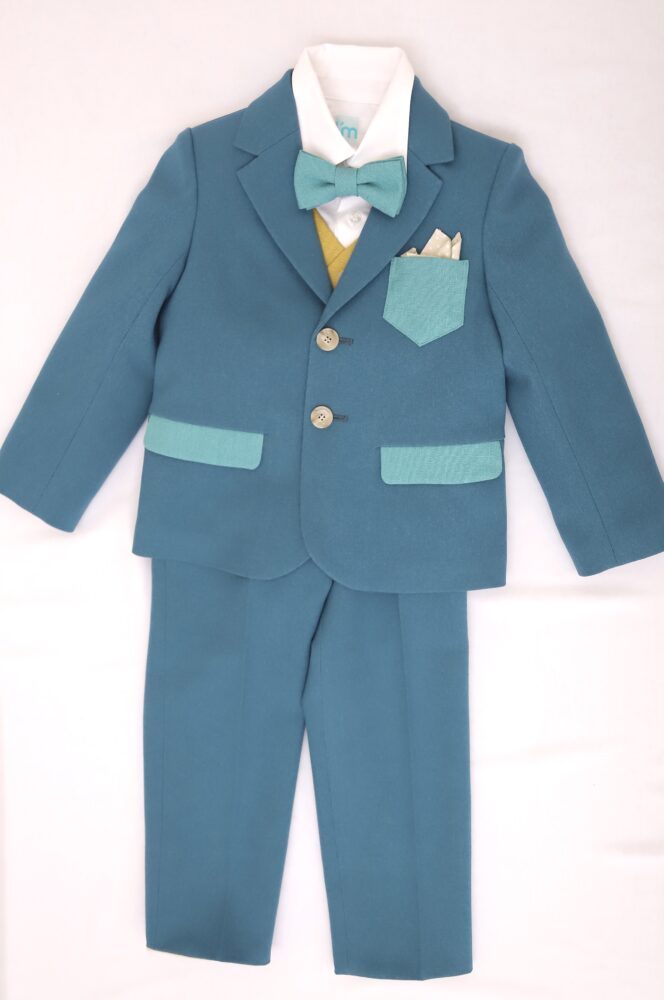ターコイズブルーのタキシードが5歳用、テラコッタのタキシードが3歳用でご用意しており、