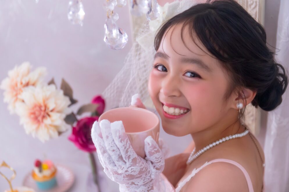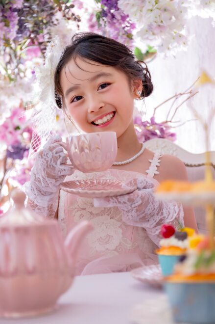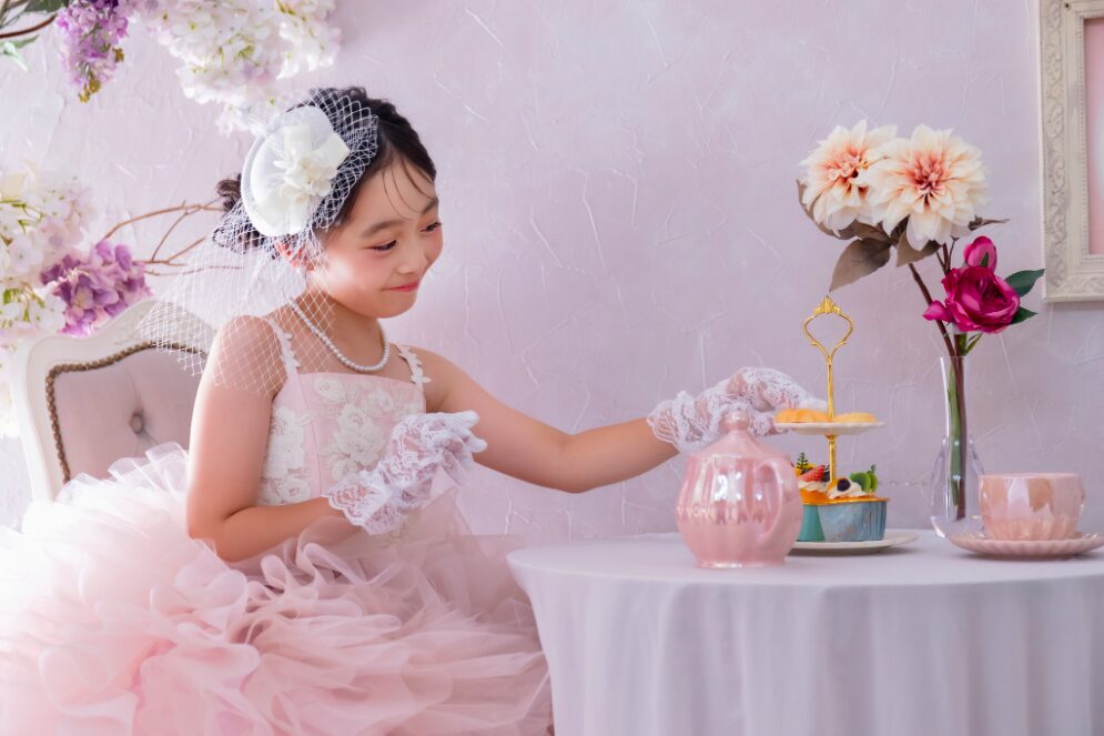 こんにちは!写真工房ぱれっと帯広店です! 今回「お花の国」で新しく誕生したビジュアルをご紹介していきます! 「Have a tea time」!ぜひ七五三のドレス姿で撮影してみてください!!
