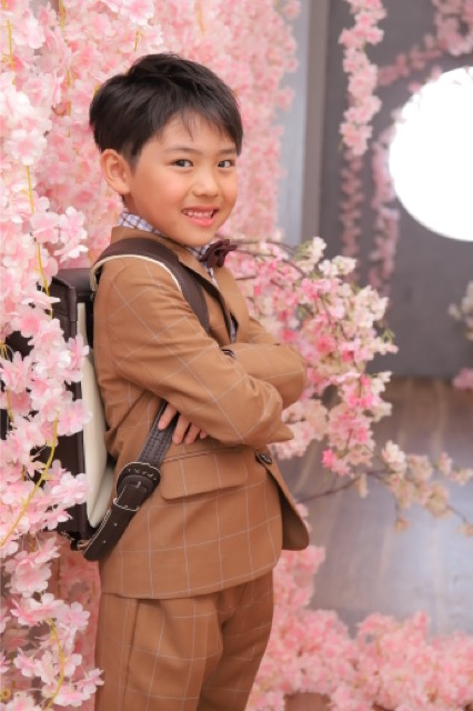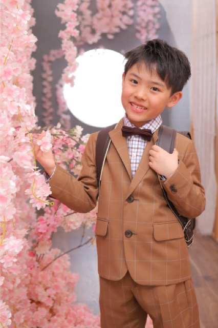 続いては、ピカピカのランドセルを背負ってのスーツスタイルです。 ブラウンのチェック柄スーツに、蝶ネクタイを合わせたおしゃれなコーディネートが、彼の明るい雰囲気にぴったり!