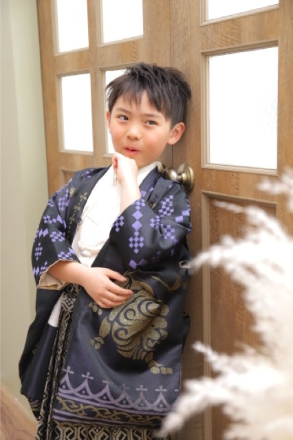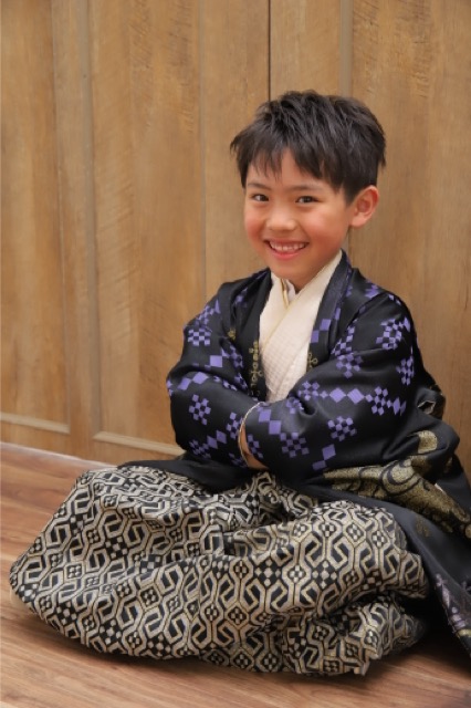 まずは伝統的な紋付袴姿から撮影スタート。 黒を基調としたお着物に、力強い金色の龍が描かれた袴がとってもお似合いです。