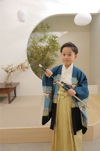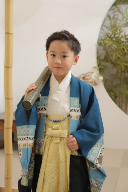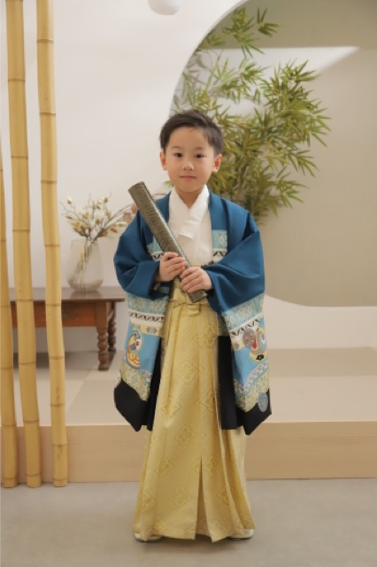 鮮やかなブルーとゴールドの袴が、彼のキリッとした表情をより引き立てていますね。