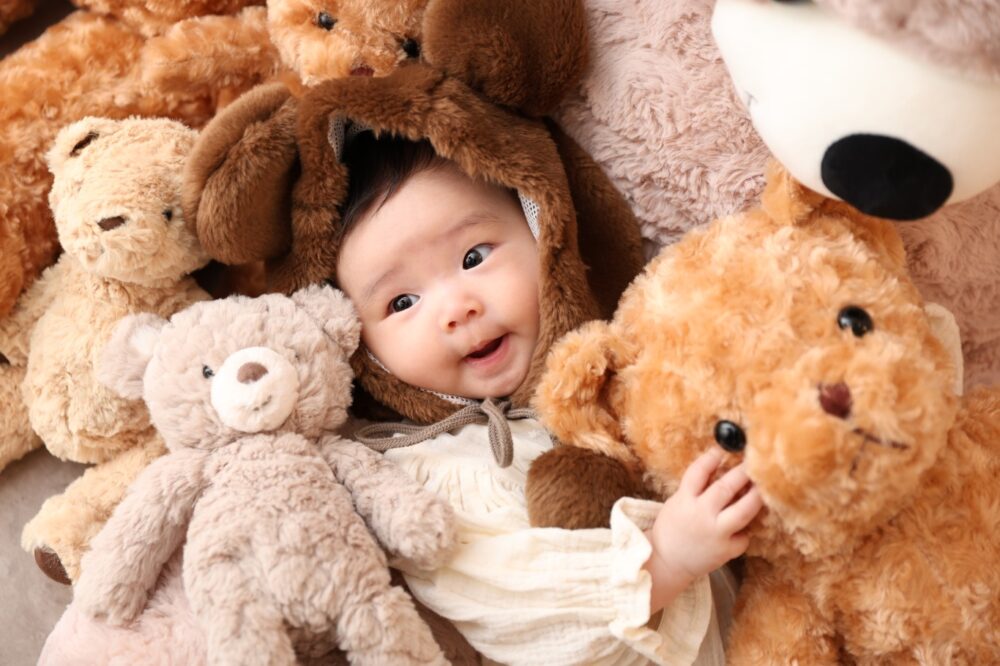 たくさんのテディベアに囲まれながら