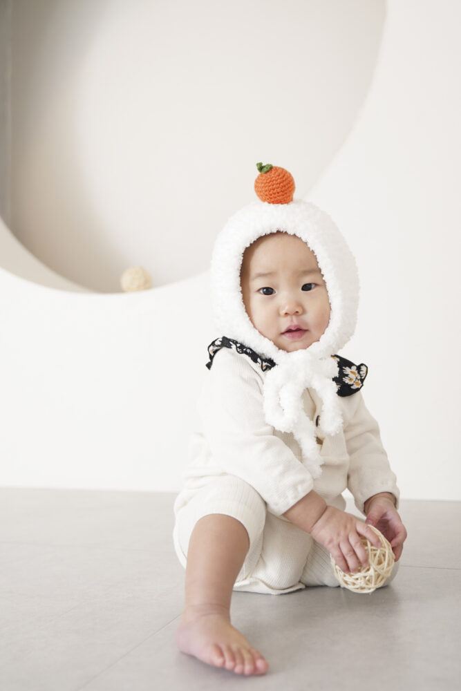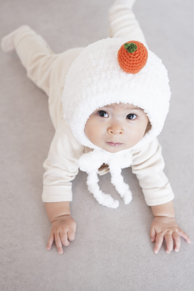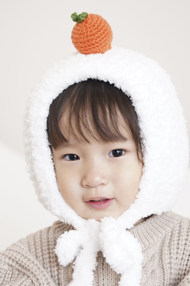 みかんの取り外しができるので、白のもこもこバブーシュカとしてもお召しいただけます。