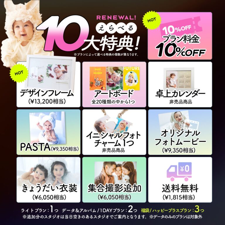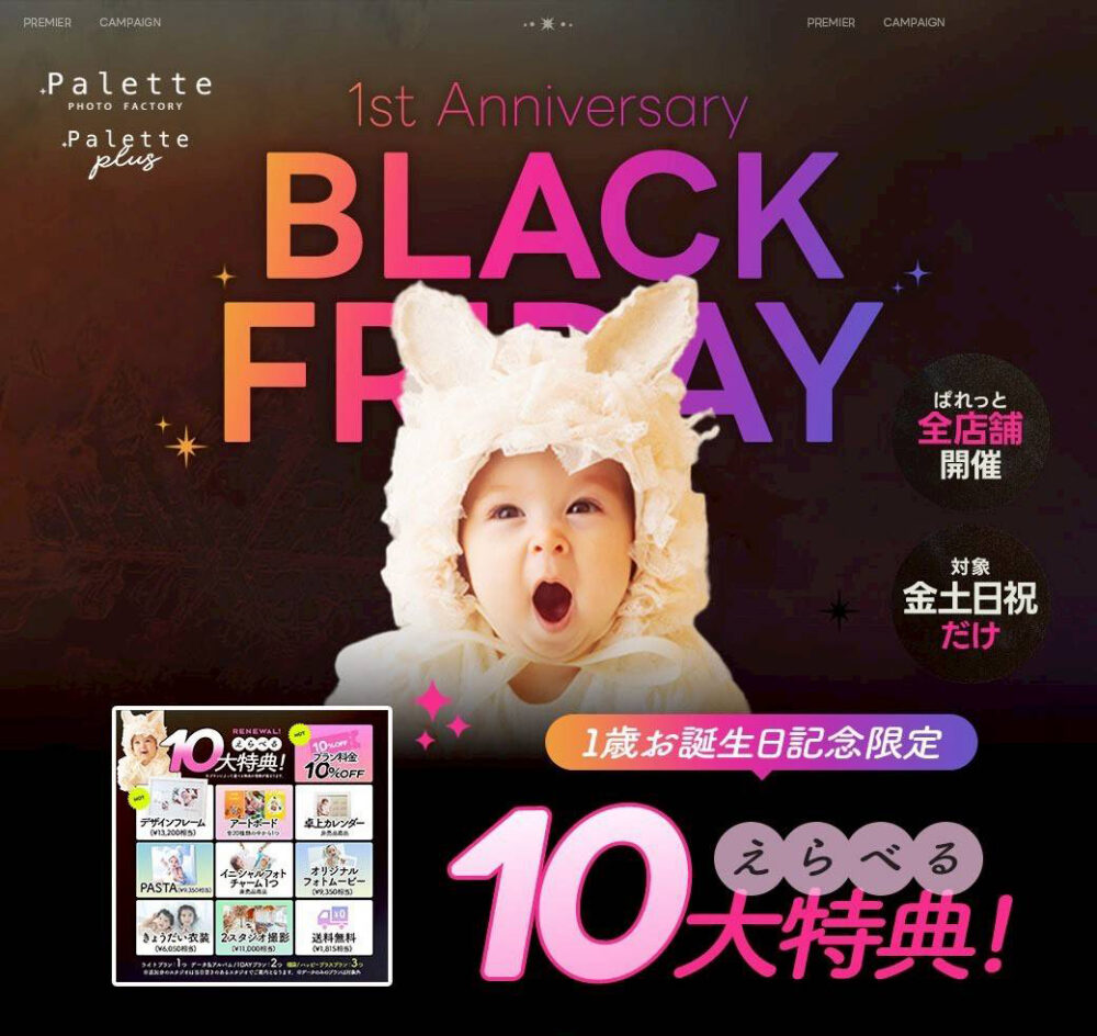 みなさまこんにちは。 写真工房ぱれっとです! 以前大好評をいただいておりましたキャンペーンが復活開催決定いたしました! 期間が7日間限定となっておりますのでお早めのご予約をお願いいたします! 衝撃の10大特典が多数その名も【ブラックフライデー】 10種類の特典から最大3つお選びいただくことができるお客様のご入用に合わせてご案内が可能となります さらにさらに!今ライトプランは3%OFFの特典のところ10%OFFにできちゃうとってもお得なセール!! そんなブラックフライデーセールをもっともっと楽しむために 1歳撮影を全力で楽しめる魅力をご紹介!