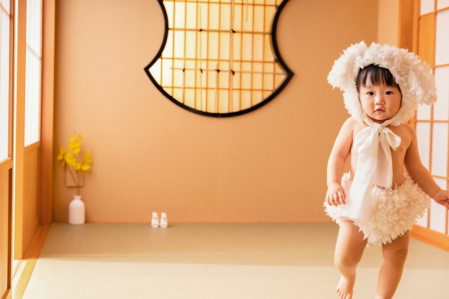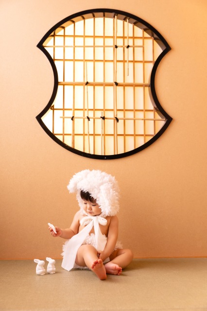 うさぎは古来より「跳躍(飛躍)」や「子孫繁栄」の象徴とされ、縁起の良い動物として愛されています。そんなうさぎに、大切な我が子がなりきる姿は、悶絶級の可愛さ!真っ白でふわふわな衣装は、赤ちゃんのピュアな肌の質感を引き立て、まるで絵本から飛び出してきたような特別な1枚に仕上がります