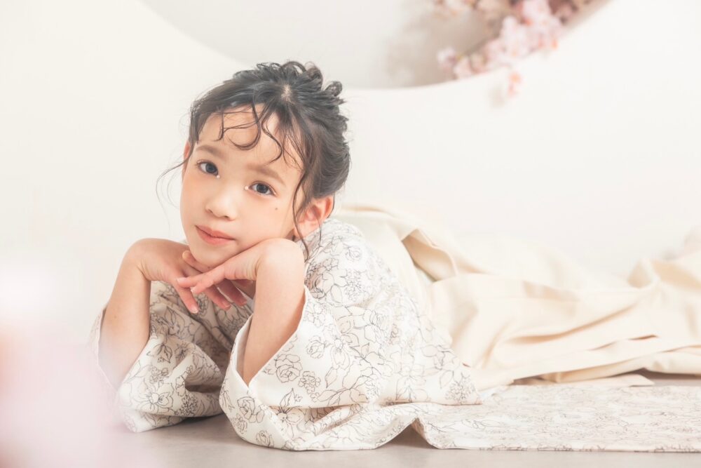 お子様ならではの魅力を引き出すナチュラルメイクで仕上げ、ヘアスタイルはあえてストレートのワンカールに。