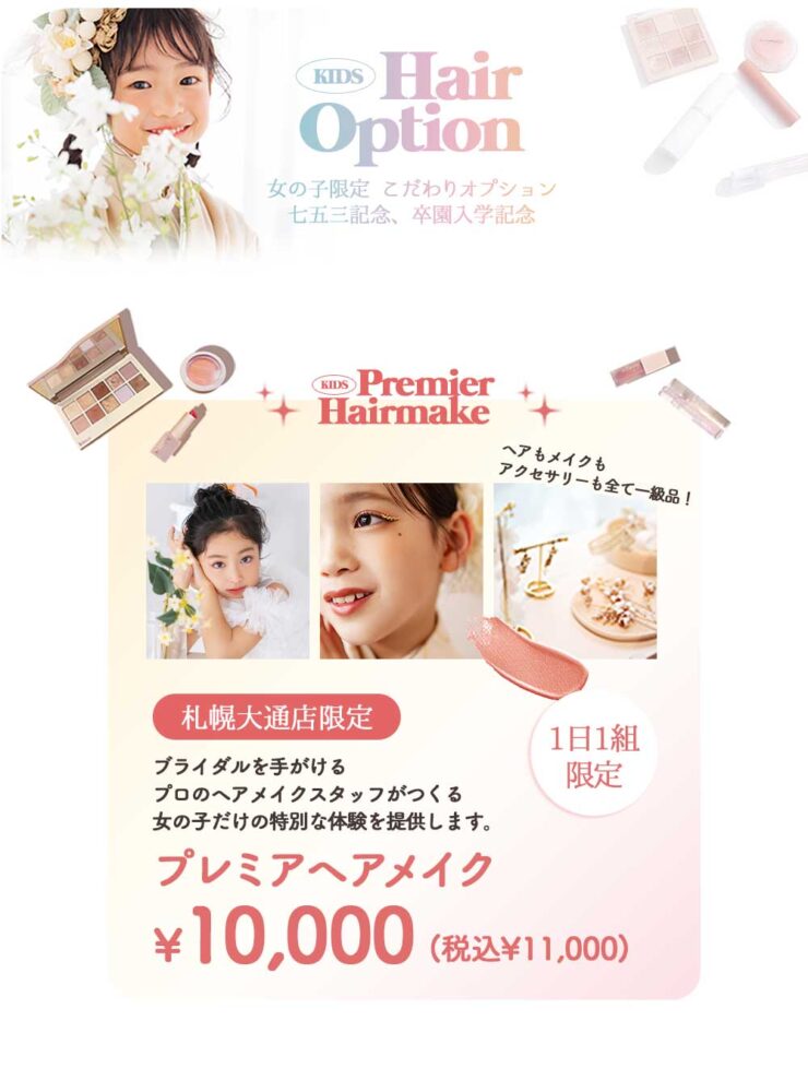その他、お嬢様のお顔の特徴とお選びいただいたお衣装に合わせ、アイシャドウ・マスカラ・アイライン・ハイライト等…