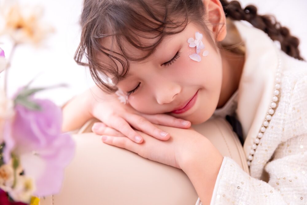 お子様の可愛さを活かしつつ、ほっぺたにお花を散りばめたりと、特別感のあるヘアメイクに仕上げました♡