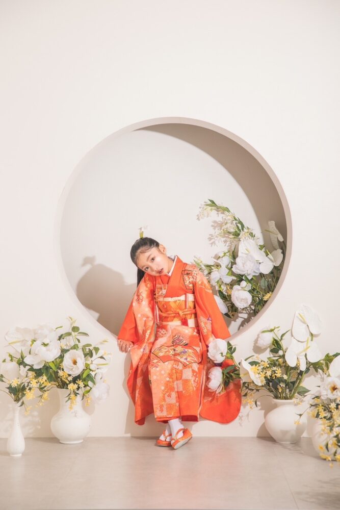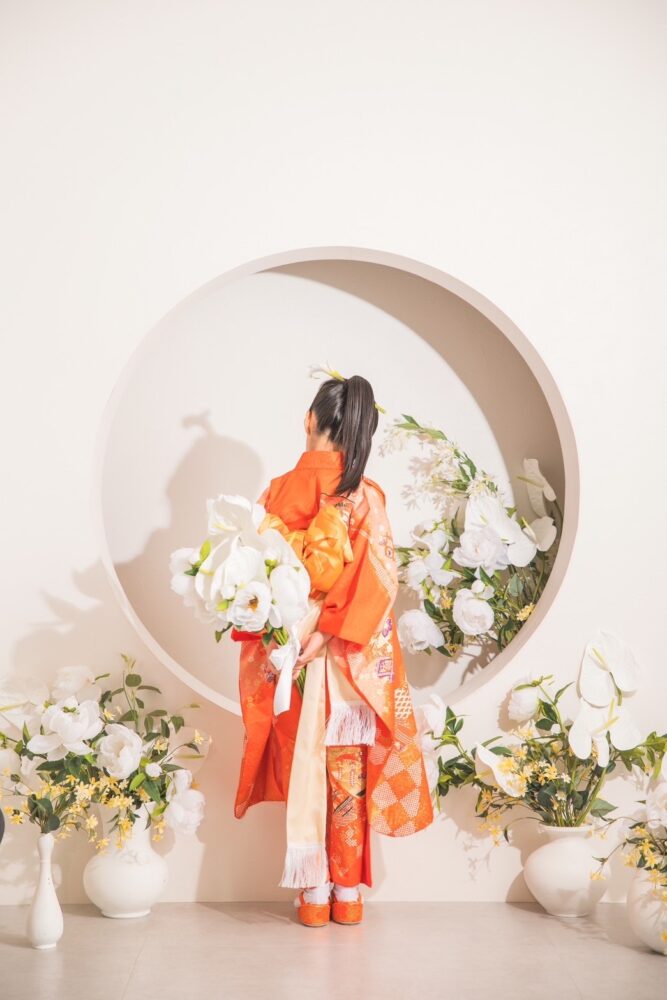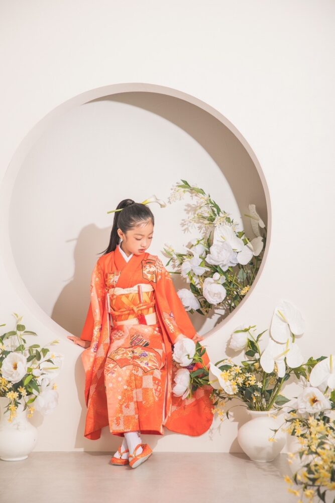 背景に映える、クラシカルなオレンジの着物をワントーンコーデで合わせて。