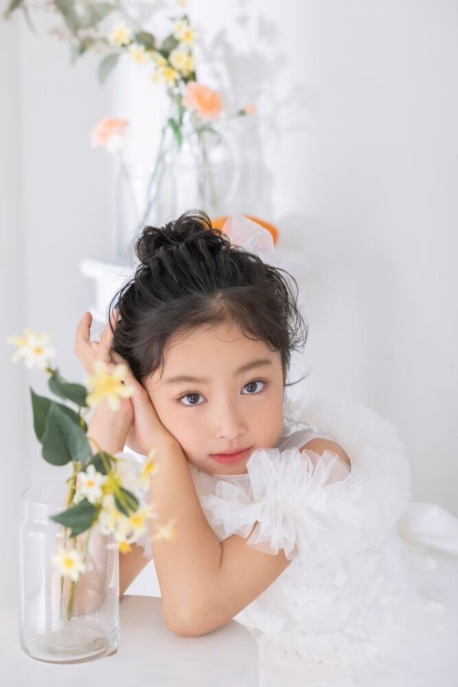 専属のヘアメイクスタッフが、ブライダルでも通用する技術で7歳のお子様にぴったりな地毛アレンジを施します!