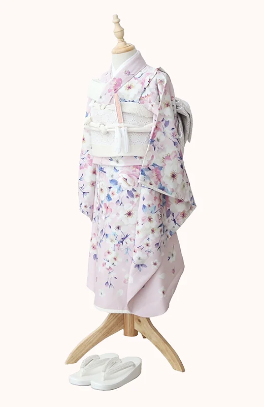 ホワイトベースに淡いベージュカラーの花柄が全面に施された、とことんガーリーな着物。