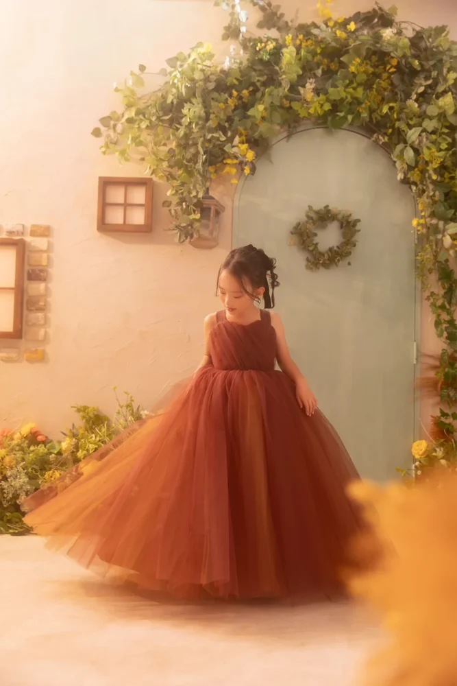 ボリュームのあるテラコッタブラウンのドレスが引き立つ