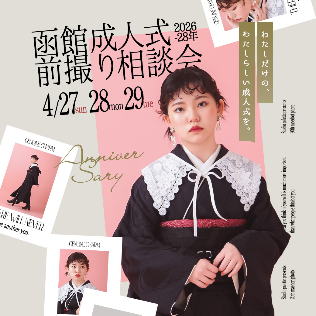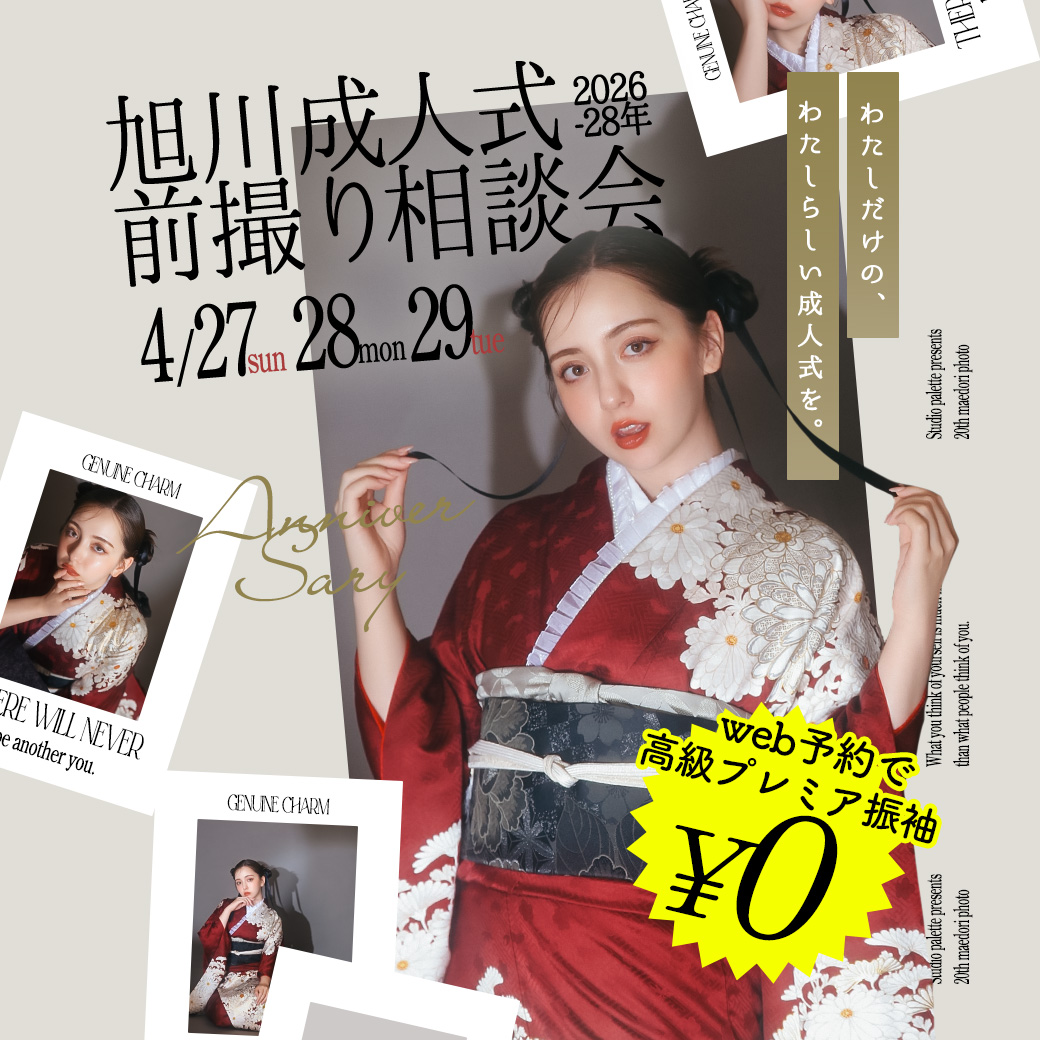 【12月】成人写真のお得なキャンペーン 年内の営業日:12月30日(火)まで函館北斗店のみ、年末年始も休まず営業いたします。 ※卒業プランのみ、プラン料金20%オフの対象となっております。 ◆EVENT 2025年1月の成人式当日のレンタル最終受付は12月10日(水)まで!【2026/1/31(土),2/1(日)】2026年最初の展示会情報も解禁!外部会場にて開催決定! 【札幌】成人式参加しない派も!12,1月金土日祝は成人式前撮り相談会 【札幌】受付開始!12,1月金土日祝は卒業袴展示会卒業袴レンタル&着付けの受付開始!早い者勝ち!展示会が大チャンス。 【12/5(金)6(土)7(日)8(月)9(火)10(水),1/31(土)2/1(日)】旭川振袖展示会 【旭川】成人式参加しない派も!12月1月金土日祝は成人式前撮り相談会 【12/5(金)6(土)7(日)8(月)9(火)10(水),1/31(土)2/1(日)】帯広振袖展示会 【帯広】成人式参加しない派も!12月1月金土日祝は成人式前撮り相談会 【12/5(金)6(土)7(日)8(月)9(火)10(水),1/31(土)2/1(日)】函館振袖展示会 【帯広】成人式参加しない派も!12月,1月 金土日祝は成人式前撮り相談会 ★成人・卒業専用LINEが登場 ★高級&トレンド振袖”プレミアライン” その年の流行しっかりを取り入れた、「かわいくって」「お洒落で」「誰かに見せたくなる」ワンランク上のお衣装をたくさん取り揃えました。お店ごとのラインナップを要チェック▼ ◆料金プラン ————————————————————————————————————————— ◆衣装 —————————————————————————————————————————————— PLAN ぱれっとの振袖プランはお得な特典付き。前撮りも式当日レンタルもこちらからCHECK! 前撮り・後撮りをご希望の方はこちら!▶︎ 成人式当日の振袖レンタルをご希望の方はこちら!▶︎ FURISODE&DRESS 新作ぞくぞく入荷!写真工房ぱれっとの振袖は古典柄やレトロなものまでバリエーションがとっても豊富。 そして成人撮影でドレスも着れちゃう☆自分にぴったりの振袖がリーズナブルな価格できっと見つかる! 振袖コレクションはこちら▶︎ ドレスコレクションはこちら▶︎