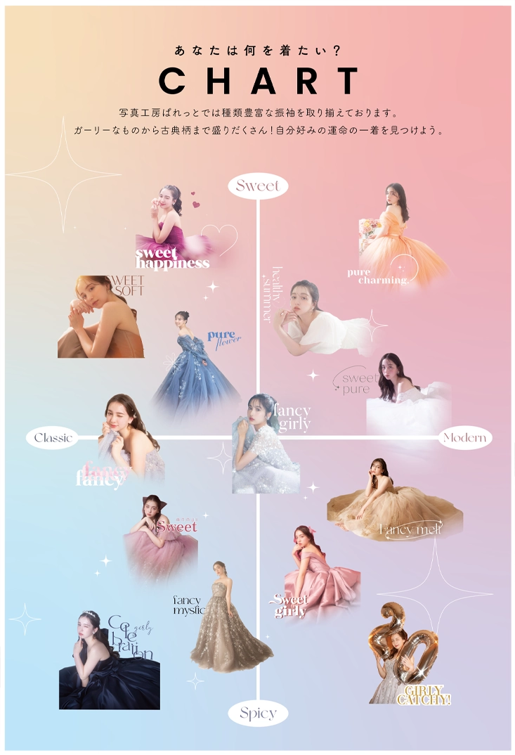 写真工房ぱれっとでは可愛い系からビンテージ系までトレンドを抑えたたくさんのドレスをご用意しております。 TEL TEL 24時間受付中!衣装試着会を予約する CHARTチャート COLLECTIONコレクション ALL サッポロファクトリー店 札幌中央店 旭川店 帯広店 函館北斗店 PLAN ぱれっとの振袖プランはお得な特典付き。前撮りも式当日レンタルもこちらからCHECK! 前撮り・後撮りをご希望の方はこちら!▶︎ 成人式当日の振袖レンタルをご希望の方はこちら!▶︎ FURISODE&DRESS 新作ぞくぞく入荷!写真工房ぱれっとの振袖は古典柄やレトロなものまでバリエーションがとっても豊富。 そして成人撮影でドレスも着れちゃう☆自分にぴったりの振袖がリーズナブルな価格できっと見つかる! 振袖コレクションはこちら▶︎ ドレスコレクションはこちら▶︎