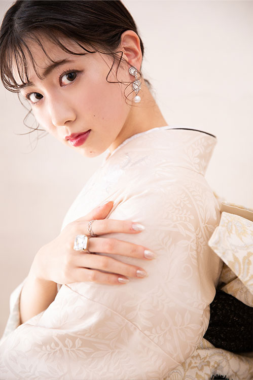 ヘアはピタッとまとめてあえて髪飾りはなしで、イヤリングを強調